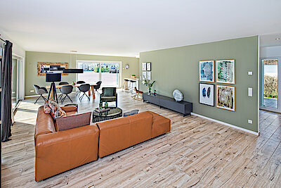 Unser Haus bietet mit einem offenen Wohn- und Kochbereich genau das, was ich mir gewünscht habe. Dieser Bereich ist das Herz unseres Zuhauses – hier wird gekocht, geredet und gelacht, einfach das Leben geteilt. Alles ist auf einer Ebene, was praktisch, großzügig und gemütlich zugleich ist. Hier leben wir unseren Traum – jeden Tag.