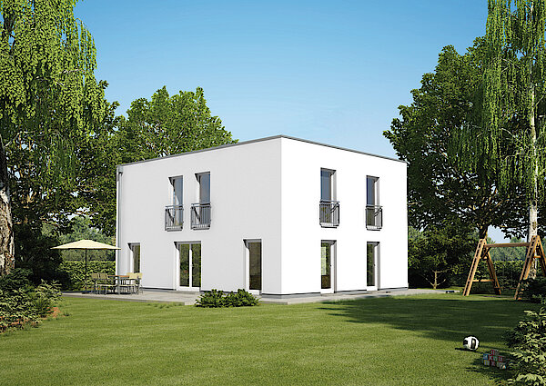 Einfamilienhäuser im Bauhaus-Stil sind kompakte Raumwunder, denn durch die zentral verbauten Dielen und Treppenaufgänge bleibt in den Schlaf- und Wohnräumen Fläche übrig, die Sie nach Ihren Vorstellungen nutzen können. Dachschrägen, die bei Satteldachhäusern die Nutzung der oberen Geschosse erschweren, entfallen.