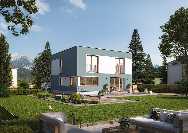 Heinz von Heiden bietet mit seinen Kubushäusern ein innovatives Baukonzept, das durch puristisches Design, klare Linien und großzügige Fensterflächen besticht. Die modernen Wohnhäuser zeichnen sich durch ihre Form und das Flachdach aus, welches nicht nur optisch überzeugt, sondern auch energetische Vorteile bietet. So kann das Flachdach als begrünte Fläche genutzt werden. Ein beliebtes Modell ist das Bauhaus Stratus 150. Mit einer Wohnfläche von etwa150 m² bietet es geräumige Zimmer, die sich über zwei Etagen erstrecken. Der offene Wohnbereich mit integrierter Küche prägt das Erdgeschoss und schafft ein großzügiges Raumgefühl. Im Obergeschoss befinden sich neben den Schlafzimmern ein Ankleidebereich sowie ein kleiner Abstellraum. Die ums Eck verlaufende Fensteranordnung und die kontrastreiche Fassadengestaltung unterstreichen das moderne Design dieses Hauses.