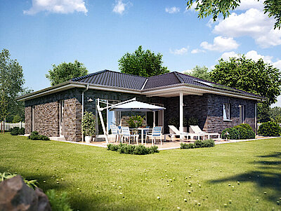 Das Walmdachhaus zeichnet sich durch seine vier geneigten Dachflächen aus, die dem Gebäude eine elegante und zeitlose Optik verleihen. Diese Dachform bietet nicht nur ästhetische Vorzüge, sondern auch funktionale Vorteile: Der große Dachüberstand schützt Fassaden und Eingangsbereiche vor Witterungseinflüssen, und die stabile Konstruktion sorgt für eine hohe Langlebigkeit. Walmdachhäuser fügen sich harmonisch in verschiedene Wohnumgebungen ein und sind ideal für Bauherren, die Wert auf eine robuste und zugleich ansprechende Architektur legen. Ein Beispiel für diesen Baustil ist der Modicus B1 von Heinz von Heiden. Dieser kompakte Bungalow bietet auf 86 m² Wohnfläche einen großzügigen Wohn- und Essbereich sowie je ein Schlaf- und Gästezimmer – alles auf einer Ebene. Dank vorkonfigurierter Grundrisse und optimierter Bauprozesse beträgt die Bauzeit maximal vier Monate.