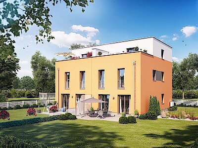 Ein Doppelhaus besteht aus zwei eigenständigen Wohneinheiten, die durch eine gemeinsame Wand miteinander verbunden sind. Jede Einheit verfügt über einen separaten Eingang und bietet den Bewohnern die Privatsphäre eines Einfamilienhauses. Dieser Baustil eignet sich besonders für Familien, die in unmittelbarer Nähe zueinander wohnen möchten, beispielsweise für Mehrgenerationenhaushalte oder enge Freunde. Zudem ist ein Doppelhaus eine kosteneffiziente Lösung, da sich die Bau- und Grundstückskosten zwischen den Parteien teilen lassen. Wie wäre es mit dem Doppelhaus F455? Mit einer Wohnfläche von 158 m² pro Wohneinheit bietet es ausreichend Platz für Familien. Das Haus besticht durch seinen modernen Grundriss und verfügt über eine rund 9 m² große Dachterrasse, die zum Entspannen an lauen Sommerabenden einlädt. Großzügige Fensterflächen sorgen für helle, lichtdurchflutete Räume und unterstreichen das zeitgemäße Design.
