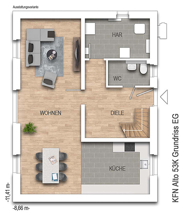 nach DIN 277Grundfläche (nach DIN 277): Die Grundfläche oder auch Nutzungsfläche gibt die tatsächliche lichte Raumgröße an. Anders als bei der Wohnfläche werden hier Dachschrägen außer Acht gelassen und Raumteile mit geringeren Stehhöhen nicht abgezogen. Bei einer Stadtvilla unterscheiden sich Grund- und Wohnfläche kaum, während bei einem Einfamilienhaus mit Dachschräge die Grundfläche deutlich größer ausfallen kann als die Wohnfläche.171,71 m² - Außenmaße:11,41 m x 8,66 m