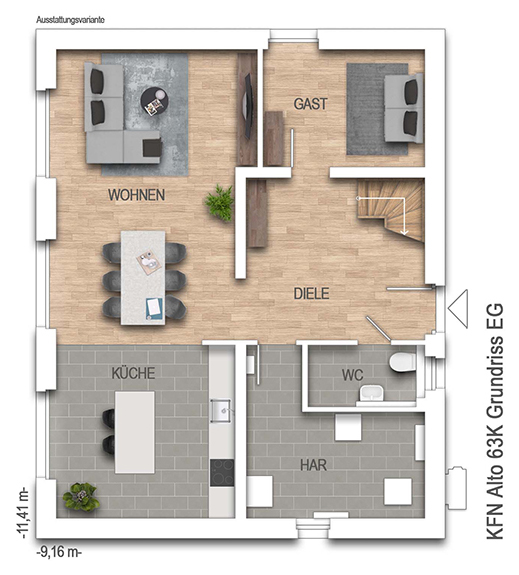 nach DIN 277Grundfläche (nach DIN 277): Die Grundfläche oder auch Nutzungsfläche gibt die tatsächliche lichte Raumgröße an. Anders als bei der Wohnfläche werden hier Dachschrägen außer Acht gelassen und Raumteile mit geringeren Stehhöhen nicht abgezogen. Bei einer Stadtvilla unterscheiden sich Grund- und Wohnfläche kaum, während bei einem Einfamilienhaus mit Dachschräge die Grundfläche deutlich größer ausfallen kann als die Wohnfläche.187,17 m² - Außenmaße:11,41 m x 9,16 m