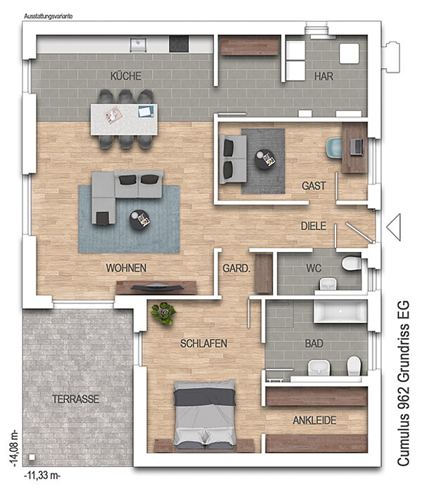 Grillparty und ein paar Regenwolken ziehen auf. Sie bleiben gelassen und rücken einfach etwas enger zusammen. Die überdachte Terrasse ist nicht nur optisch top, sondern auch einfach praktisch. Der Bungalow Cumulus 962 mit 125 m² verbindet Ihr sommerliches Frischluftbedürfnis mit dem Wunsch nach intelligent konzipiertem Wohnraum. Zugang zur Terrasse hat man nicht nur von dem Wohnbereich, sondern auch vom Schlafzimmer. Im Hausanschlussraum, der direkt an die Küche angrenzt, können einige Vorräte Platz finden. Die Abbildung zeigt eine Ausstattungsvariante.