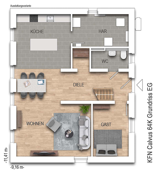Schon die einladene Diele sprich für das Traumhaus Calvus 64K. 160 m² verteilt auf 5 Zimmer, einer großen Küche mit direkten Zugang zum Hausanschlussraum, Duschbad und WC sprechen für sich. Und nicht nur das: nebenbei erfüllt das Calvus 64K alle Anforderungen eines KFN-(Traum-) Hauses, denn das zweigeschossige Einfamilienhaus ist mit einer Lüftungsanlage mit Wärmerückgewinnung, einer Wärmepumpe und einer PV-Anlage mit Speicher ausgestattet, also mit modernster Haustechnik, die nicht nur nachhaltig, sondern energieeffizient ist.