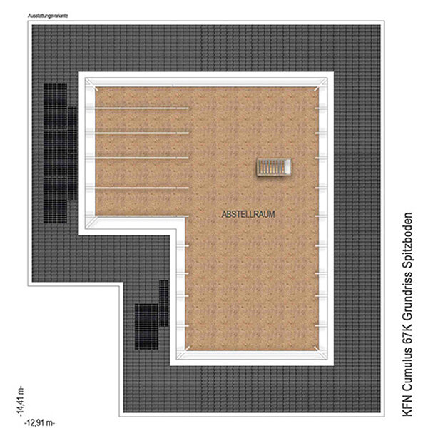 nach DIN 277Grundfläche (nach DIN 277): Die Grundfläche oder auch Nutzungsfläche gibt die tatsächliche lichte Raumgröße an. Anders als bei der Wohnfläche werden hier Dachschrägen außer Acht gelassen und Raumteile mit geringeren Stehhöhen nicht abgezogen. Bei einer Stadtvilla unterscheiden sich Grund- und Wohnfläche kaum, während bei einem Einfamilienhaus mit Dachschräge die Grundfläche deutlich größer ausfallen kann als die Wohnfläche.187,29 m² - Außenmaße:14,41 m x 9,41 m