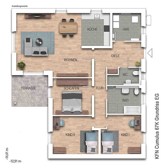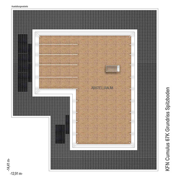 Sie mögen gerne alles auf einer Etage, dann ist der Cumulus W67K genau der Richtige für sie. Auf 130 m2 bietet er zwei ähnlich große Kinderzimmer, die auch anderweitig verwendet werden können. Das große Wohn- und Esszimmer ist durch die großen Fenster mit Licht durchfluchtet. Zu alldem erfüllt der Cumulus W67K alle Anforderungen eines energieeffizienten (Traum-) Hauses. Der Winkelbungalow besitzt die modernste Haustechnik: Er ist ausgestattet mit einer Lüftungsanlage mit Wärmerückgewinnung, einer Wärmepumpe und einer PV-Anlage mit Speicher. Diese ist nicht nur nachhaltig, sondern auch energieeffizient. Der KFN-Förderung steht mit dem Cumulus W67K nichts im Weg.