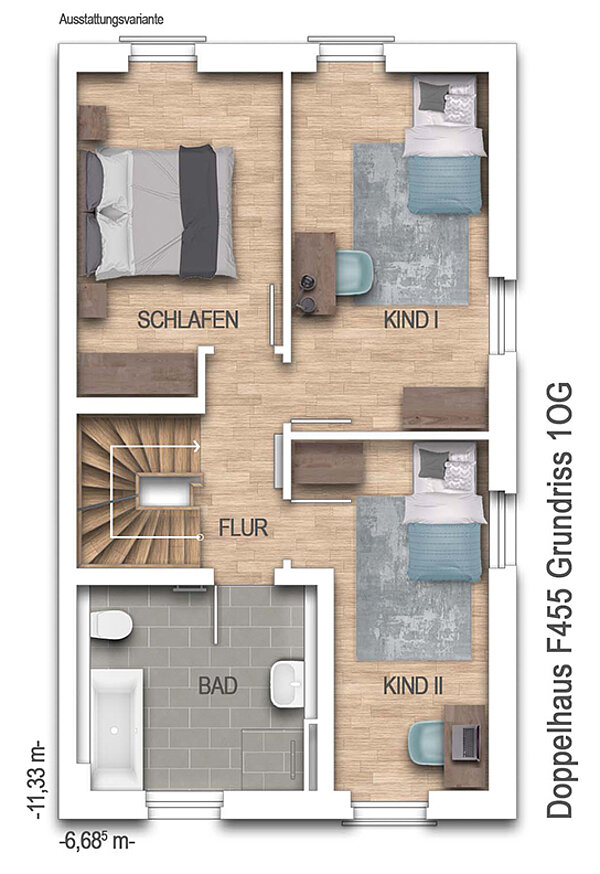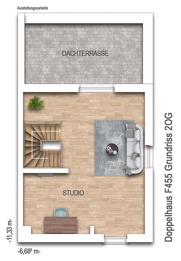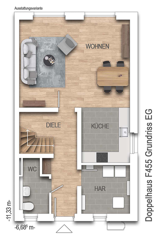 nach DIN 277Grundfläche (nach DIN 277): Die Grundfläche oder auch Nutzungsfläche gibt die tatsächliche lichte Raumgröße an. Anders als bei der Wohnfläche werden hier Dachschrägen außer Acht gelassen und Raumteile mit geringeren Stehhöhen nicht abgezogen. Bei einer Stadtvilla unterscheiden sich Grund- und Wohnfläche kaum, während bei einem Einfamilienhaus mit Dachschräge die Grundfläche deutlich größer ausfallen kann als die Wohnfläche.176,01 m² - Außenmaße:6,68 m x 11,33 m