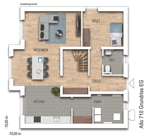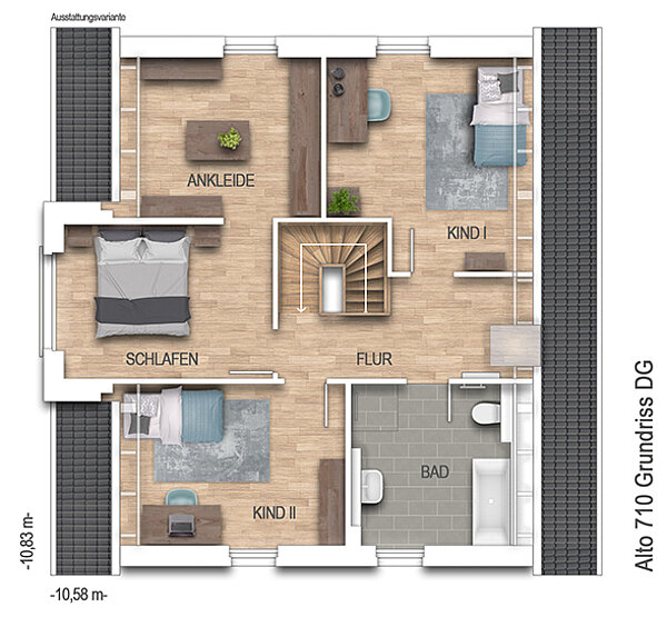 Mitten im Leben, mitten im Haus - Sie wollen lieber direkt ankommen und bevorzugen eine offene Gestaltung? Dann begrenzen Sie den klassischen Hausflur und nutzen Sie den Platz für's tatsächliche Wohnen, mit mehr Licht und weniger Türen. Das Alto 710 bieten Ihnen mehr als 150 m² Wohnfläche mit 3 Zimmern im Dachgeschoss. An das Schlafzimmer grenzt gleich der Ankleidebereich an. Wie Ihr Haus aussehen soll entscheiden Sie allein - wir stehen helfend mit Rat und Tat zur Seite. Die Abbildung zeigt eine Ausstattungsvariante.