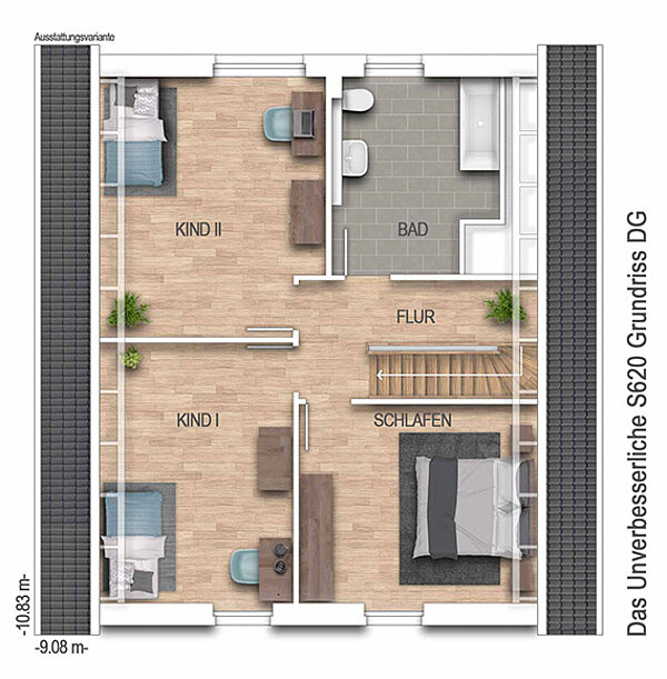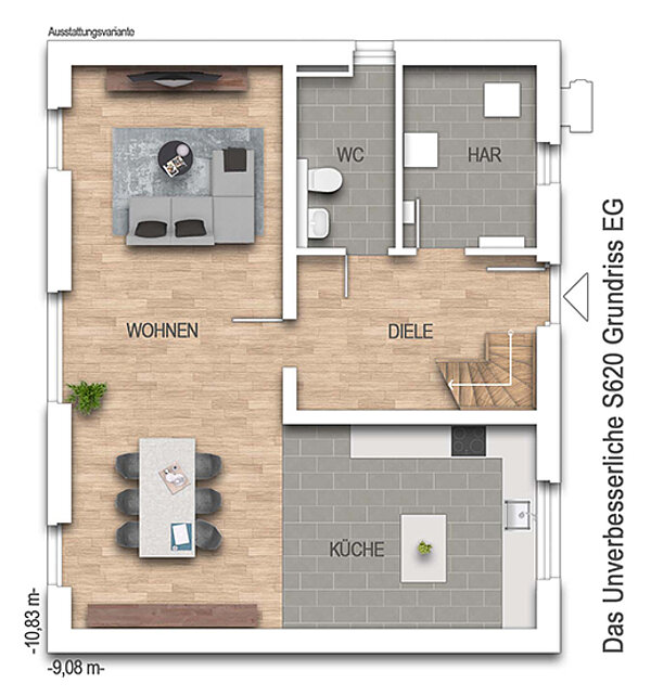 nach DIN 277Grundfläche (nach DIN 277): Die Grundfläche oder auch Nutzungsfläche gibt die tatsächliche lichte Raumgröße an. Anders als bei der Wohnfläche werden hier Dachschrägen außer Acht gelassen und Raumteile mit geringeren Stehhöhen nicht abgezogen. Bei einer Stadtvilla unterscheiden sich Grund- und Wohnfläche kaum, während bei einem Einfamilienhaus mit Dachschräge die Grundfläche deutlich größer ausfallen kann als die Wohnfläche.153,61 m² - Außenmaße:10,83 m x 9,08 m