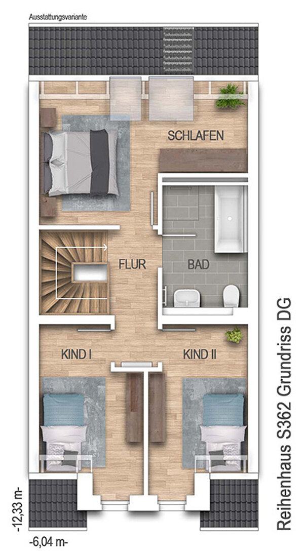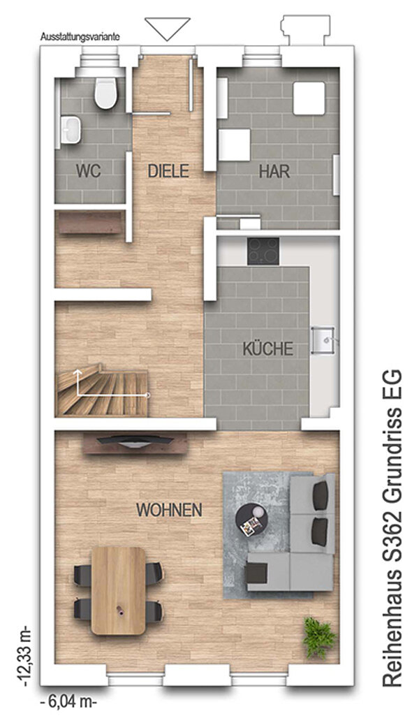 nach DIN 277Grundfläche (nach DIN 277): Die Grundfläche oder auch Nutzungsfläche gibt die tatsächliche lichte Raumgröße an. Anders als bei der Wohnfläche werden hier Dachschrägen außer Acht gelassen und Raumteile mit geringeren Stehhöhen nicht abgezogen. Bei einer Stadtvilla unterscheiden sich Grund- und Wohnfläche kaum, während bei einem Einfamilienhaus mit Dachschräge die Grundfläche deutlich größer ausfallen kann als die Wohnfläche.114,83 m² - Außenmaße:6,04 m x 12,33 m
