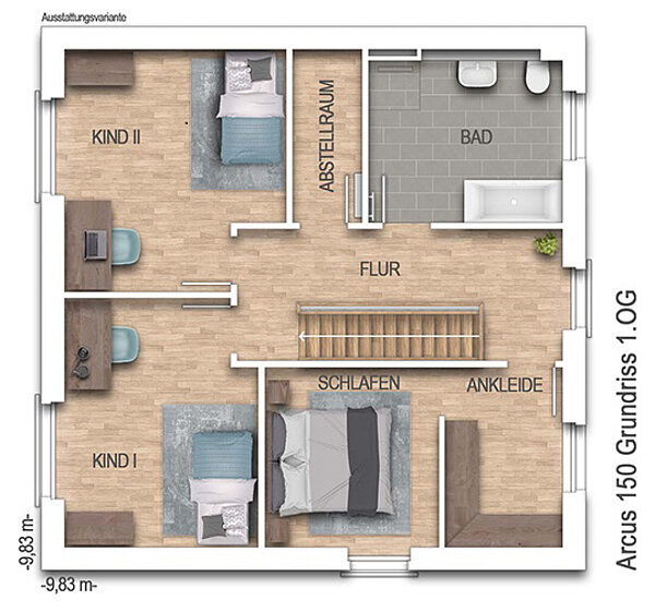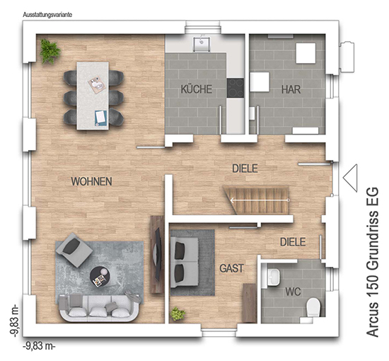 nach DIN 277Grundfläche (nach DIN 277): Die Grundfläche oder auch Nutzungsfläche gibt die tatsächliche lichte Raumgröße an. Anders als bei der Wohnfläche werden hier Dachschrägen außer Acht gelassen und Raumteile mit geringeren Stehhöhen nicht abgezogen. Bei einer Stadtvilla unterscheiden sich Grund- und Wohnfläche kaum, während bei einem Einfamilienhaus mit Dachschräge die Grundfläche deutlich größer ausfallen kann als die Wohnfläche.152,07 m² - Außenmaße:9,83 m x 9,83 m