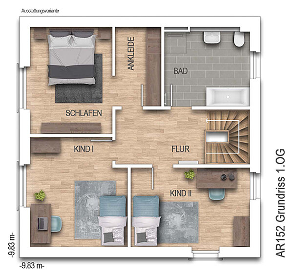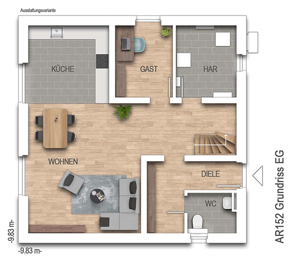 nach DIN 277Grundfläche (nach DIN 277): Die Grundfläche oder auch Nutzungsfläche gibt die tatsächliche lichte Raumgröße an. Anders als bei der Wohnfläche werden hier Dachschrägen außer Acht gelassen und Raumteile mit geringeren Stehhöhen nicht abgezogen. Bei einer Stadtvilla unterscheiden sich Grund- und Wohnfläche kaum, während bei einem Einfamilienhaus mit Dachschräge die Grundfläche deutlich größer ausfallen kann als die Wohnfläche.152,13 m² - Außenmaße:9,83 m x 9,83 m