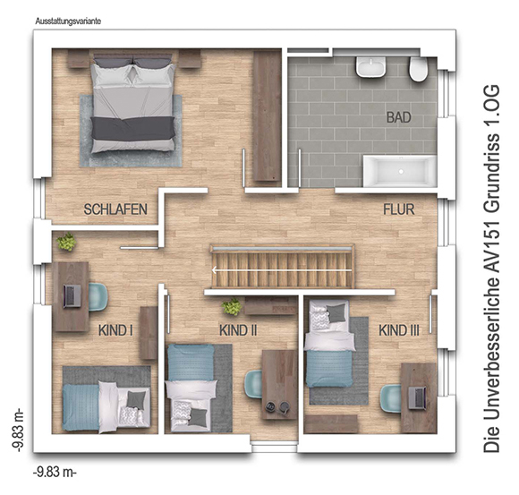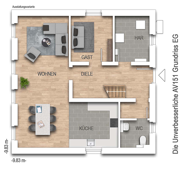 nach DIN 277Grundfläche (nach DIN 277): Die Grundfläche oder auch Nutzungsfläche gibt die tatsächliche lichte Raumgröße an. Anders als bei der Wohnfläche werden hier Dachschrägen außer Acht gelassen und Raumteile mit geringeren Stehhöhen nicht abgezogen. Bei einer Stadtvilla unterscheiden sich Grund- und Wohnfläche kaum, während bei einem Einfamilienhaus mit Dachschräge die Grundfläche deutlich größer ausfallen kann als die Wohnfläche.151,91 m² - Außenmaße:9,83 m x 9,83 m