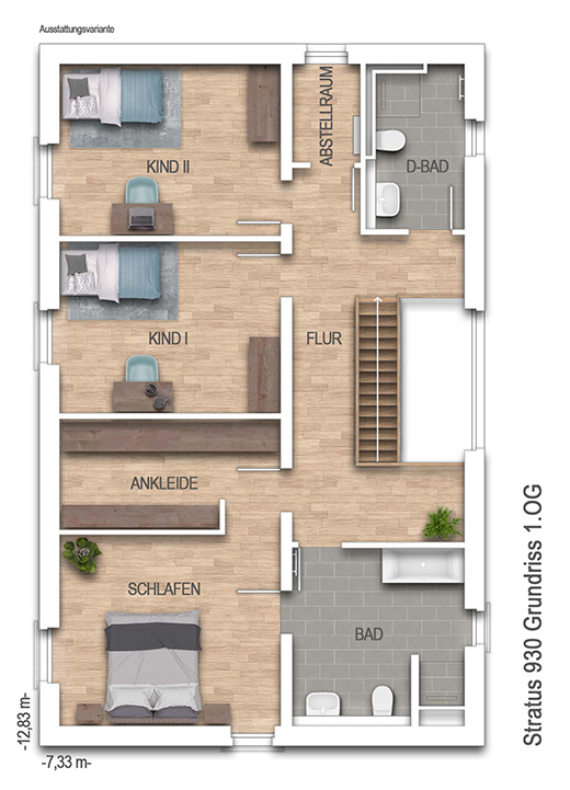 Ein modernes Bauhaus mit Flachdach, klaren Linien und durchdachter Architektur – auf 200 m² Wohnfläche vereint dieses Zuhause offene Grundrisse mit behaglichen Rückzugsorten. Große Fenster mit 3-fach Verglasung lassen viel Licht ins Innere und werden durch elektrische Rollläden ergänzt. Eine effiziente Wärmepumpe und die integrierte Lüftungsanlage sorgen für ein angenehmes Raumklima zu jeder Jahreszeit. Im Erdgeschoss überzeugt der großzügige Wohn- und Essbereich mit offener Küche, ergänzt durch praktische Räume wie Vorrat, Hauswirtschaftsraum und Gästezimmer mit eigenem Bad. Das Obergeschoss des Stratus 930 bietet zwei helle Kinderzimmer, ein modernes Familienbad sowie einen komfortablen Elternbereich mit Schlafzimmer, Ankleide und separatem Bad. Klare Formen, moderne Technik und ein durchdachtes Raumkonzept machen dieses Haus zu einem perfekten Ort für die ganze Familie.