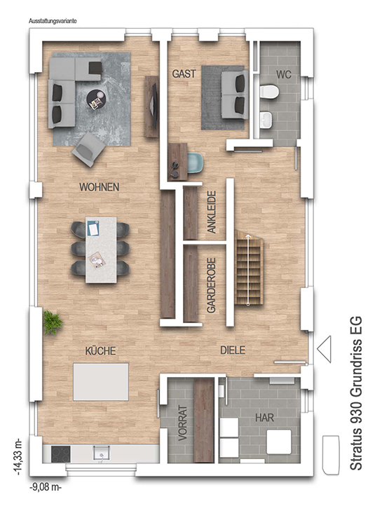 nach DIN 277Grundfläche (nach DIN 277): Die Grundfläche oder auch Nutzungsfläche gibt die tatsächliche lichte Raumgröße an. Anders als bei der Wohnfläche werden hier Dachschrägen außer Acht gelassen und Raumteile mit geringeren Stehhöhen nicht abgezogen. Bei einer Stadtvilla unterscheiden sich Grund- und Wohnfläche kaum, während bei einem Einfamilienhaus mit Dachschräge die Grundfläche deutlich größer ausfallen kann als die Wohnfläche.206,22 m² - Außenmaße:14,33 m x 9,08 m