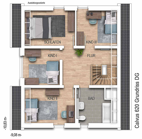 nach DIN 277Grundfläche (nach DIN 277): Die Grundfläche oder auch Nutzungsfläche gibt die tatsächliche lichte Raumgröße an. Anders als bei der Wohnfläche werden hier Dachschrägen außer Acht gelassen und Raumteile mit geringeren Stehhöhen nicht abgezogen. Bei einer Stadtvilla unterscheiden sich Grund- und Wohnfläche kaum, während bei einem Einfamilienhaus mit Dachschräge die Grundfläche deutlich größer ausfallen kann als die Wohnfläche.150,10 m² - Außenmaße:9,08 m x 10,83 m