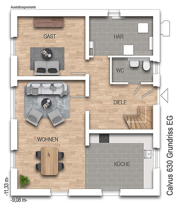 nach DIN 277Grundfläche (nach DIN 277): Die Grundfläche oder auch Nutzungsfläche gibt die tatsächliche lichte Raumgröße an. Anders als bei der Wohnfläche werden hier Dachschrägen außer Acht gelassen und Raumteile mit geringeren Stehhöhen nicht abgezogen. Bei einer Stadtvilla unterscheiden sich Grund- und Wohnfläche kaum, während bei einem Einfamilienhaus mit Dachschräge die Grundfläche deutlich größer ausfallen kann als die Wohnfläche.159,55 m² - Außenmaße:9,08 m x 11,33 m