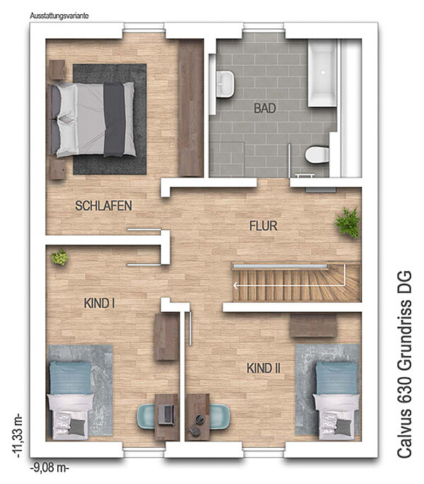 Das Wichtigste für Sie ist eine solide Basis auf der Sie bauen können? Unser Calvus 630 kommt mit allem was Sie brauchen. Jeder Raum hat seine Funktion: Ein großer Wohnraum für gemütliches Beisammen sein, eine separate Küche, die Kochaktivitäten für sich bleiben lässt und ein extra Zimmer für Gäste oder als Heimbüro. Im oberen Stockwerk ist Platz für drei etwa gleichgroße Räume. Aus insgesamt 150 m² Wohnfläche lässt sich einiges machen. Klingt das nach einem Eigenheim für Sie? Wir sichern Sie mit 5-Sterne Bauherren-SchutzbriefPlus ab und beraten Sie zu jeder Zeit. Gemeinsam setzen wir Ihre Wohnträume in die Tat um. Die Abbildung zeigt eine Ausstattungsvariante.