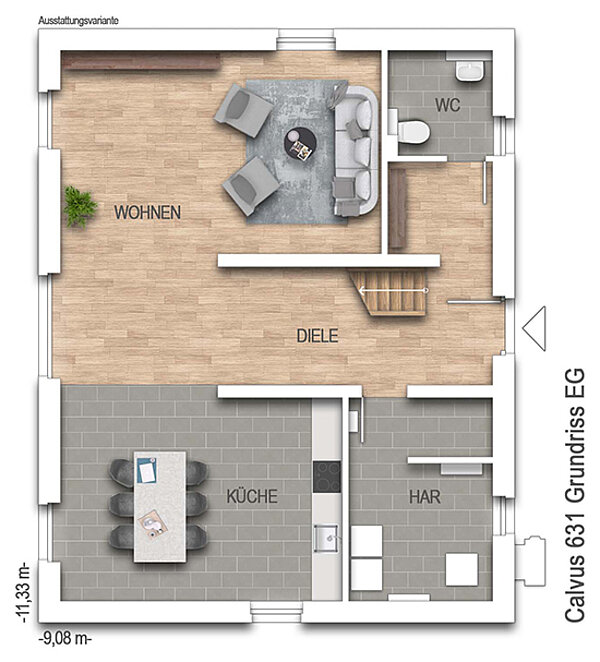 nach DIN 277Grundfläche (nach DIN 277): Die Grundfläche oder auch Nutzungsfläche gibt die tatsächliche lichte Raumgröße an. Anders als bei der Wohnfläche werden hier Dachschrägen außer Acht gelassen und Raumteile mit geringeren Stehhöhen nicht abgezogen. Bei einer Stadtvilla unterscheiden sich Grund- und Wohnfläche kaum, während bei einem Einfamilienhaus mit Dachschräge die Grundfläche deutlich größer ausfallen kann als die Wohnfläche.163,92 m² - Außenmaße:9,08 m x 11,33 m