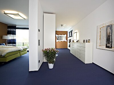 Über die freitragende Zweiholmtreppe im Flur, die im Raum zu schweben scheint, gelangt man ins Obergeschoss. Dort befindet sich das große Elternschlafzimmer mit angrenzender Ankleide und einem eigenen Badezimmer. Gemeinsam mit dem benachbarten Kinderzimmer hat es einen direkten Zugang zum Balkon. Das zweite Kinderzimmer befindet sich gegenüber und besitzt einen eigenen Balkon, der zusätzlich von der Diele aus betreten werden kann. Praktisch ist das separate Bad für die Kinder. Dank der bodentiefen Fenster mit französischem Balkon gelangt auch in der oberen Etage viel Licht ins Haus.