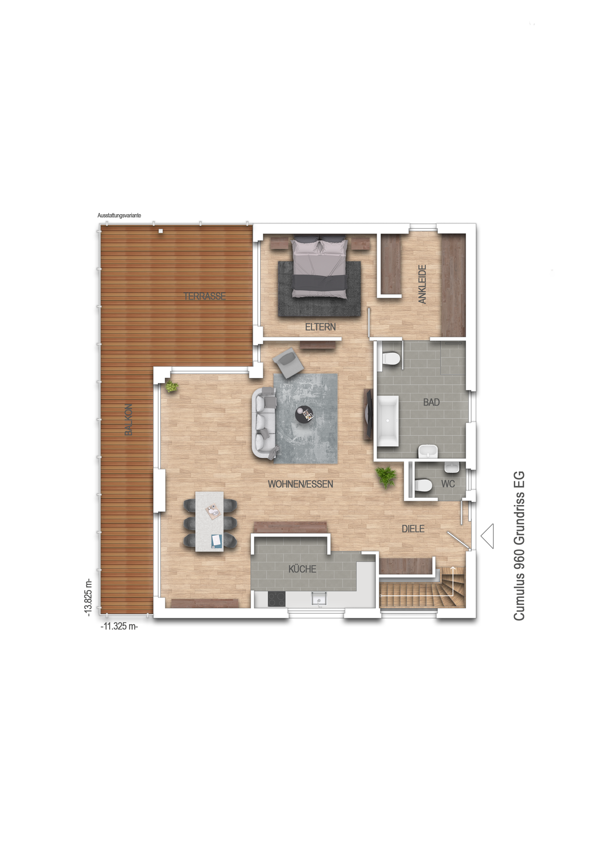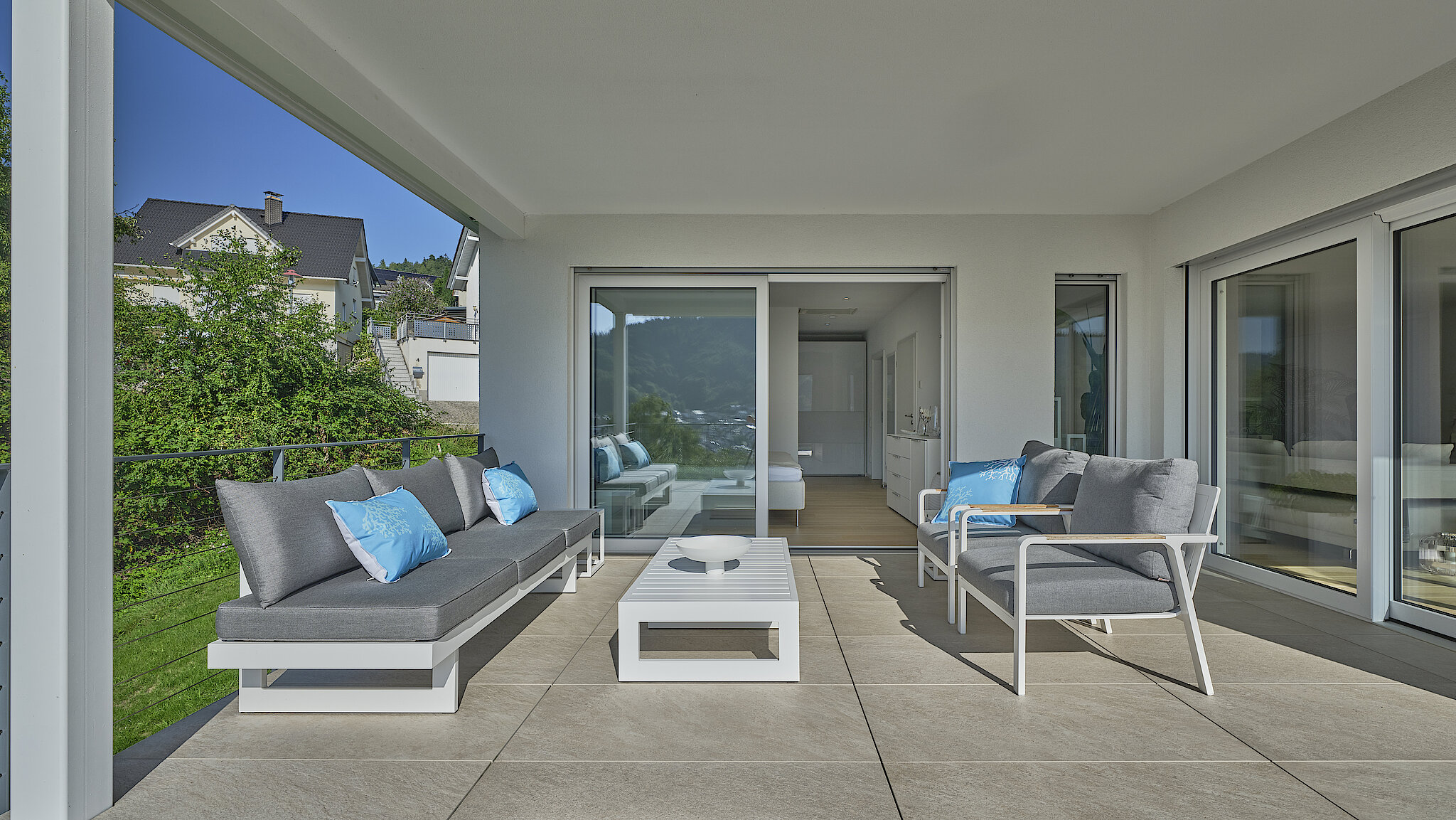 Das Erdgeschoss wird durch ein Schlafzimmer mit angrenzendem Ankleidebereich, ein stilvolles Badezimmer und ein Gäste-WC ergänzt. Ein Highlight des Hauses ist der Balkon über die gesamte Hauslänge, der sowohl vom Wohnzimmer als auch vom Schlafzimmer zugänglich ist. Hier genießen die Bauherren den herrlichen Ausblick auf die hügelige, naturnahe Umgebung. Unterhalb des großen Balkons lädt eine überdachte Sitzmöglichkeit zu entspannten Stunden im Freien ein – egal, ob Sonne oder Regen.