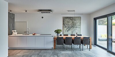 Im Eingangsbereich, rechts neben der Hauseingangstür, befindet sich das Duschbad gefolgt von einem weiteren Raum, welchen die Bauherren als Garderobe nutzen. Auf der gegenüberliegenden Seite ist das Büro der Baufamilie gelegen. An den Eingangsbereich schließt sich der offfene Wohn-/ Essbereich mit insgesamt 64,78 m² an. Dieser stellt einen der zahlreichen Besonderheiten des Hauses dar. Der im Wohnzimmer platzierte Kamin sorgt für die nötige Wohlfühlatmosphäre und bietet die Grundlage für gemeinsame, warme und kuschelige Abende in der heimischen Wohnlandschaft. Bei der gesamten Ausstattung spiegelt sich der Stil der Bauherren wider. Mit geschmackvoller Einrichtung werden gekonnt moderne Akzente gesetzt, sodass die persönliche Note des Ehepaares in Szene gerückt wird. Farbtechnisch sind Wandfarben sowie Möbelstücke aufeinander abgestimmt und verstärkt in Naturfarben ausgewählt worden. Pflanzen und Bilder bringen den persönlichen Charme der Bauherren in die eigenen vier Wände und machen aus dem Haus ein richtiges Zuhause. An den Wohnbereich schließt sich die Küche mit verbundenem Essbereich an. Mit Blick auf die große Kochinsel bekommt selbst der größte Kochverweigerer Spaß am Zubereiten von leckeren Speisen.