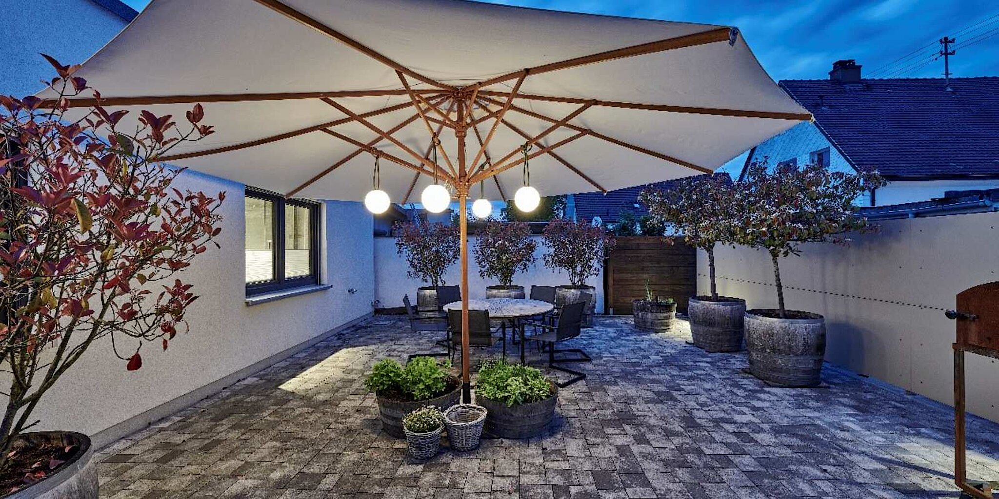 Der mit der Kochinsel intelligent verbundene Esstisch bietet genügend Platz für Gäste, sodass gemeinsamen Mahlzeiten oder lustigen Spieleabenden mit Familie, Freunden oder Bekannten nichts mehr im Wege steht. Dank der bodentiefen Fenster ist der Wohn- und Essbereich wunderbar lichtdurchflutet und es gelangt viel natürliches Tageslicht in diesen Bereich des Hauses. Das Schlafzimmer der Bauherren findet innerhalb der rechten Haushälfte seinen Platz. Von diesem Zimmer aus gelangen die Beiden direkt in das 22,98 m² große Familienbad. Moderne Ausstattung und stilvolle Möbel machen aus dem Badezimmer eine absolute Wohlfühloase. An der großen Kochinsel vorbei, gelangen die Bewohner in den Hausanschlussraum, welcher mit einer Tür verbunden direkt zum Abstellraum führt. Dieser bietet zusätzlichen Stauraum. Die große Terrasse lässt auf erholsame Sommerabende an der frischen Luft mit Blick auf die heimische Badeoase samt Swimming-Pool schließen. Diese bietet gleichermaßen den nötigen Unterschlupf bei plötzlich aufkommendem Regenwetter.