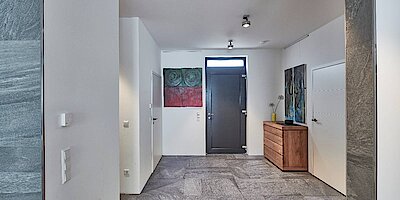 Nach Aussage des Bauherrenehepaares ist das persönliche Highlight an ihrem neuen Traumhaus die Individualität, die das Haus verkörpert. Zum Beispiel sorgt die Deckenfreiheit, dank einer Höhe von 2,80 m für ein offenes Wohngefühl. Die Fliesen an den Wänden innerhalb des Wohnbereichs sind der persönliche Eyecatcher der Baufamilie.