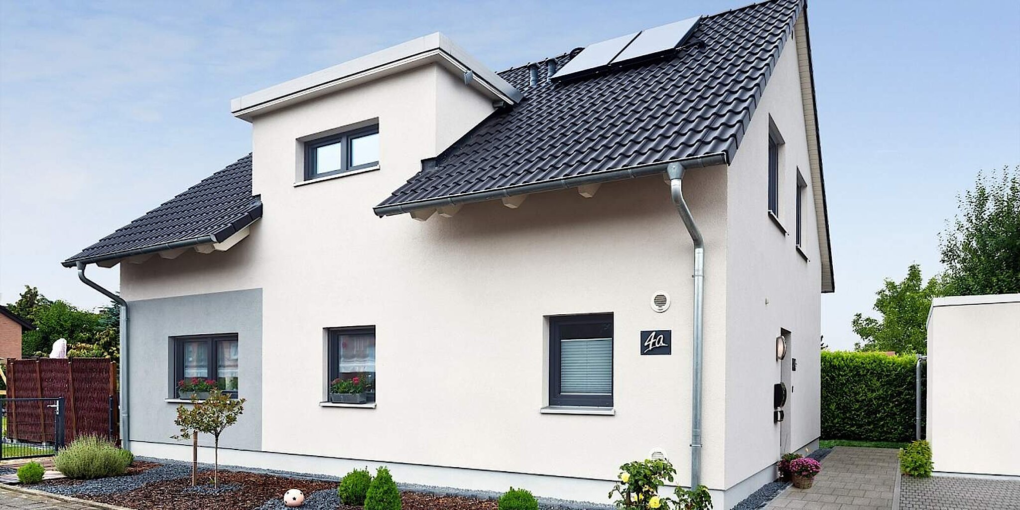 Kompromisse mussten die Schmitz bei der Innen- und Außengestaltung ihres künftigen Heims nicht eingehen. Eine Flachdachgaube, ein Satteldach mit einem Neigungswinkel von 38 Grad, sowie grauer Dekorputz als Farbtupfer auf dem weißverputzten Haus sind Details, die es zu einem Unikat machen.