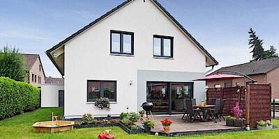 Dass es irgendwann etwas Eigenes sein sollte, stand für die Baufamilie Schmitz stets fest. Doch zunächst standen auch sie vor der Frage, wo das künftige Zuhause stehen sollte. „Ein bisschen im Grünen in einer gewachsenen Nachbarschaft – das war unser Traum, und wir konnten ihn zum Glück verwirklichen“, erzählt Stephanie Schmitz. Wie so oft, kam der Zufall zu Hilfe: „Nachbarn meiner Mutter wurde der eigene Garten im Alter zu groß. Sie wollten sich verkleinern und boten uns einen Teil als Baugrund an.“ Für die Schmitz war dies die ideale Lösung.