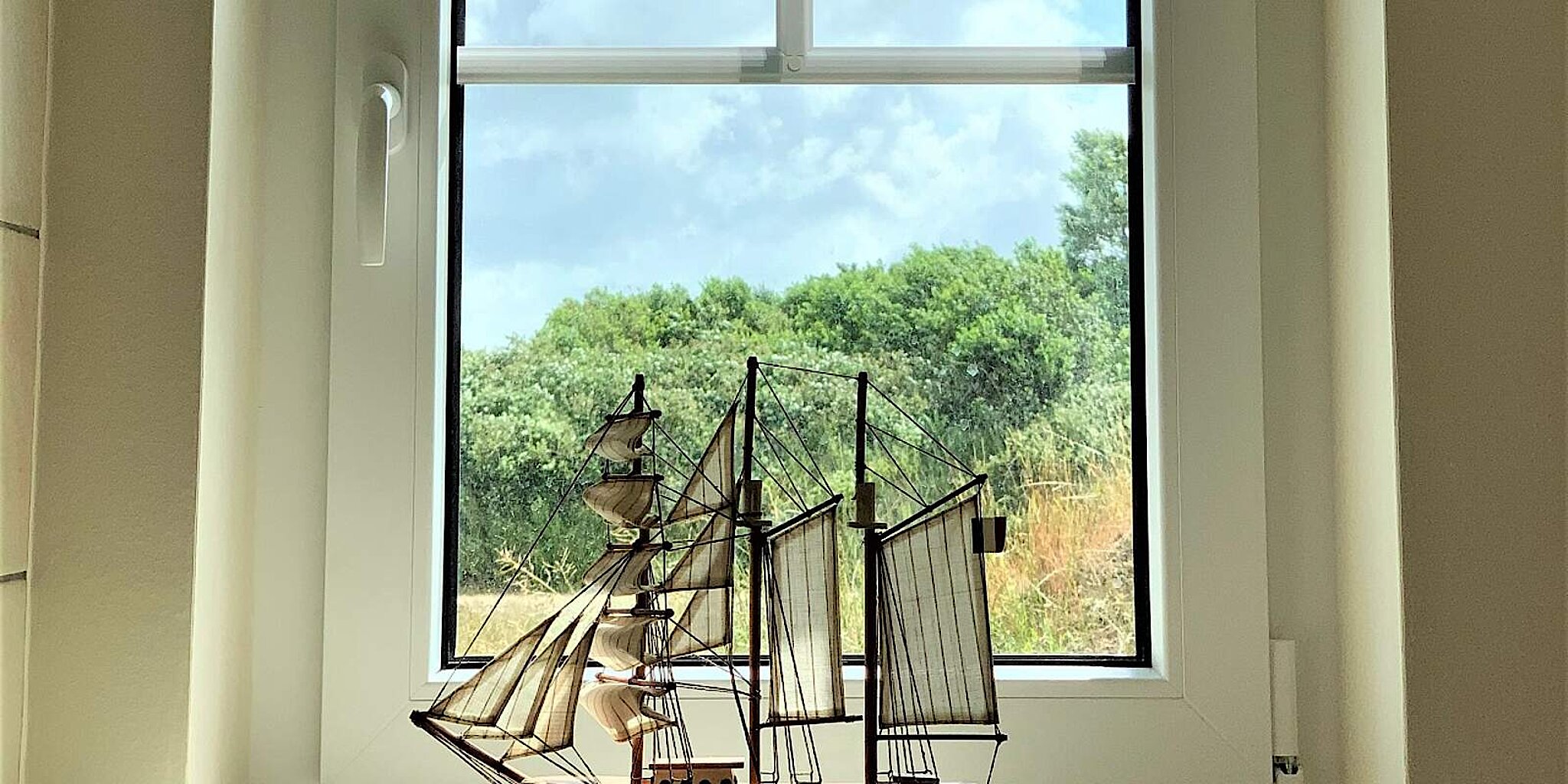 Der Mix aus bodentiefen und halbhohen Fenstern fügt sich sehr gut in den friesischen Stil des Hauses ein.