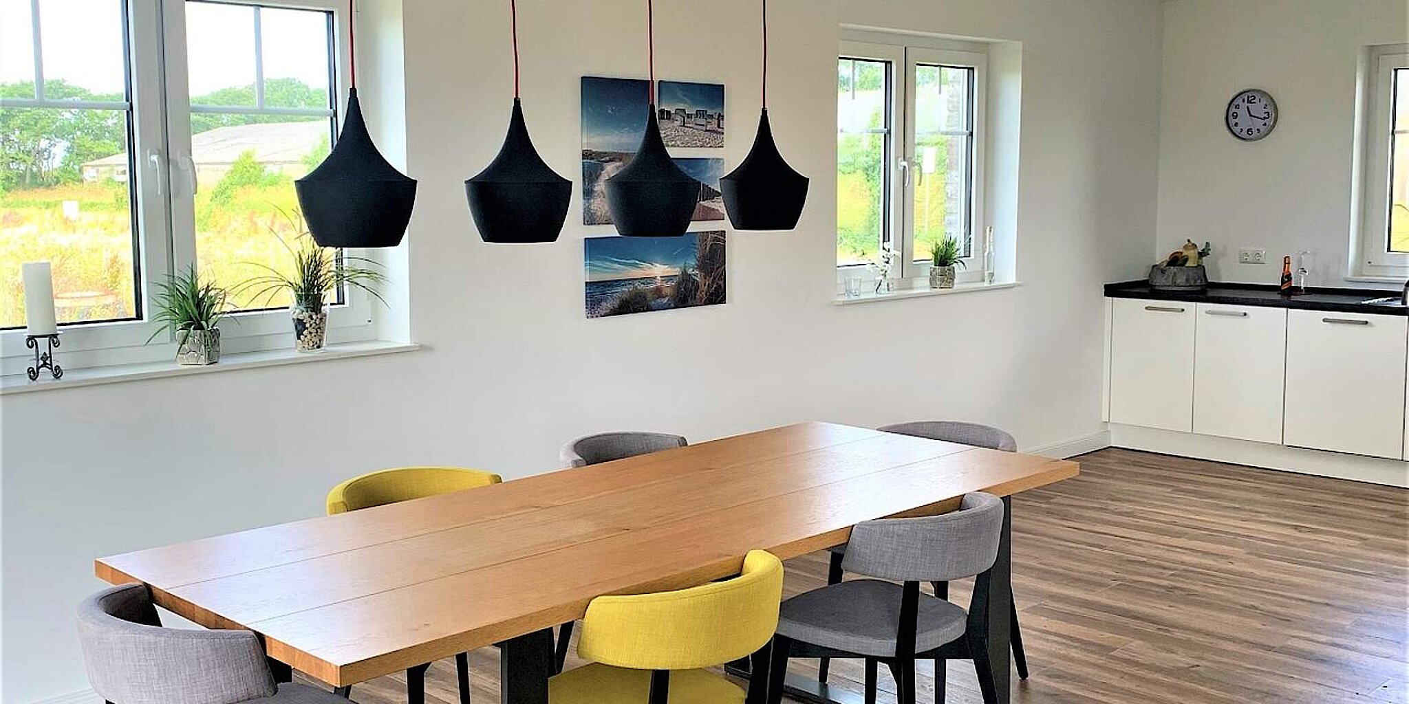 Der offene Wohn- und Essbereich bilden gemeinsam mit der Küche eine moderne L-Form.