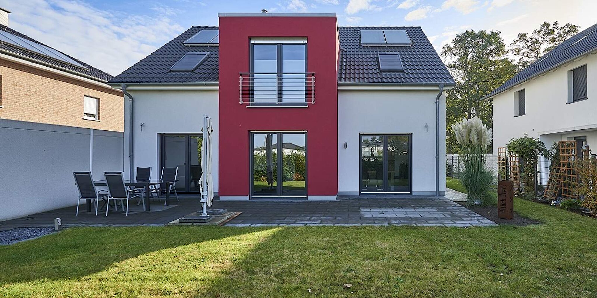 Das Einfamilienhaus Alto 630 dieser Bauherrenfamilie zeigt, dass klassisch nicht gleich langweilig bedeutet. Die massive Bauweise „Stein auf Stein“ garantiert ein qualitativ hochwertiges Zuhause. Durch die auffällige rote Putzfarbe sticht der Flachdachterrassengiebel sofort ins Auge und ist ein Eyecatcher für jeden, der vorbei geht. Aber nicht nur von außen, sondern auch von innen ist das Einfamilienhaus einzigartig.