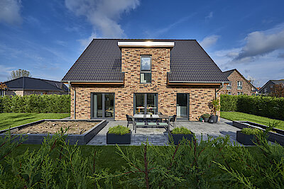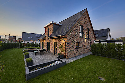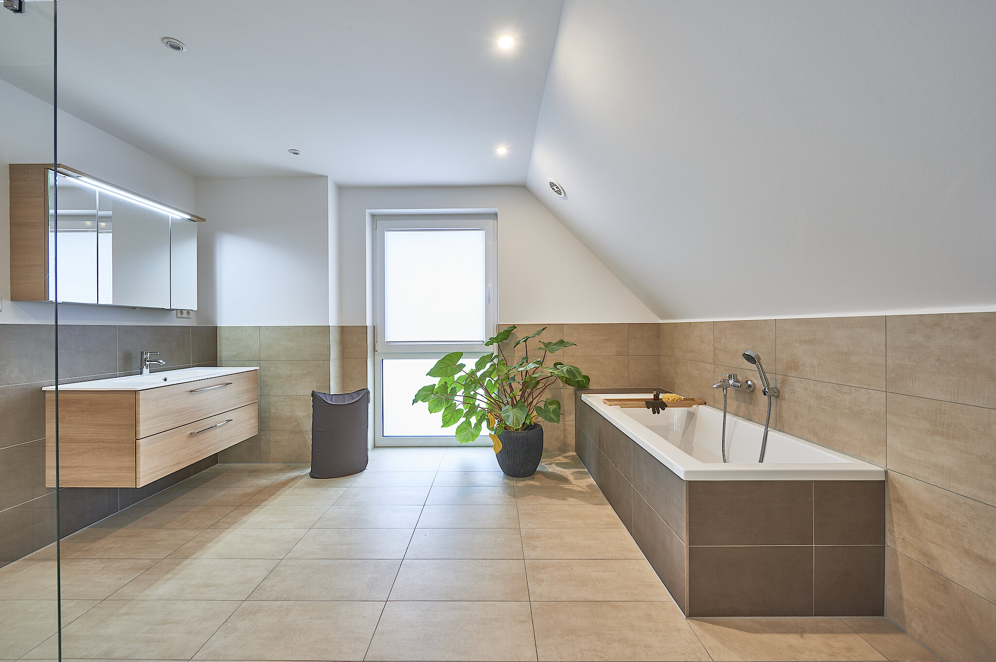 Mit seinen Abmessungen von 12,32 m² x 9,45 m² hat das Einfamilienhaus einen klassisch rechteckigen Grundriss, das damit harmonierende Satteldach mit einer Neigung von 45 Grad sorgt für gemütliche Räume im Dachgeschoss. Als architektonisches Highlight zählt ohne Zweifel der Zwerchgiebel mit Flachdachgaube. Er peppt die klassische Architektur auf. Die Idee zur Flachdachgaube hatte Bauherrin Rebekka. Ihrem Faible für Gestaltung verdankt das Familiennest viel seiner Individualität. Die verblendete Fassade gibt dem Haus seine auffällige Optik. Die Wahl der Klinker hat mit Abstand die meiste Zeit in Anspruch genommen. Gut Ding will Weile haben – so sagt man und das trifft für das Ehepaar in puncto Fassade genau zu. Im Rückblick sagen beide erleichtert: „Es hat sich gelohnt, so viel Zeit in die Auswahl der Fassade zu stecken. All die Vergleiche, die vielen Fahrten durch Neubaugebiete…“ Bauherrin Rebekka wollte unbedingt ein Naturprodukt und hat sich von ihrem Wunsch, einen Verblendstein zu verwenden, nicht abbringen lassen. Für den besonderen Fassadeneffekt fiel die Entscheidung auf Klinker im Farbton „Moorbrand torfbunt“. Der Mix aus Klinkerverschalung und dunklen Dachziegeln ist das gelungene Resultat. Die Baufamilie hat sich mit 13 m² für ein besonders geräumiges Badezimmer entschieden. „Lieber eine Badewanne oder eine Dusche? Auf die Frage des Architekten antworteten mein Mann und ich einstimmig: Wir möchten beide Optionen haben“, erzählt Rebecca. Dass die Dusche bodengleich wird, stand für die beiden von vornherein fest. Im gesamten Haus sind Fliesen verlegt. Bis aufs Bad wählte das Paar diese in länglichem Format und in Holzoptik. Die Fußbodenheizung schafft überall wohlige Wärme. Den fehlenden Keller ersetzt der Hausanschlussraum (HAR). Hier sind Haus- und Servertechnik sowie sämtliche Anschlüsse und die Heiztechnik für die Fernwärme untergebracht.