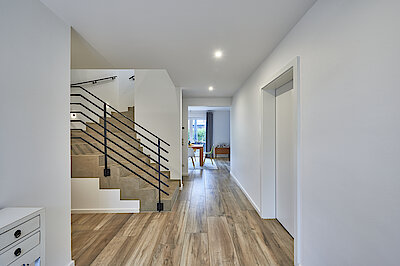 Ein Hoch auf das Betondesign! Die Innentreppe ist als Betontreppe ausgeführt und der Stufenbelag ist aus geschliffenem Beton hergestellt worden, was sich gut macht. Zunächst sollte noch eine Fliese die Betontreppe zieren, man kann nur von Glück sprechen, dass sich die Bauherren letztlich dagegen entschieden haben. Denn Beton sieht immer gut aus und punktet zudem mit zwei pragmatischen Kriterien: Er nutzt sich nicht ab und ist auch noch pflegeleicht. „Wenn ich die Haustür aufschließe und unsere geräumige Diele betrete, zieht mich der raue Charme unserer Betontreppe jedes Mal aufs Neue in Bann. Ich finde das Zusammenspiel von Beton und Holzoptik vor den weißen Wänden einfach fantastisch“, freut sich der Hausherr.