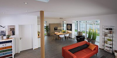 Vom Windfang gelangt man in den großzügigen Wohnbereich mit offener Küche – den Lebensmittelpunkt des Hauses. Hier bietet sich auf über 30 Quadratmetern ausreichend Platz zum gemeinsamen Kochen und Beisammensein mit der ganzen Familie. Vom Erker gelangt man direkt auf die Terrasse und in den Garten der Stadtvilla. Ein Arbeits- oder Gästezimmer, sowie Gäste-WC und Hausanschlussraum komplettieren das Erdgeschoss.