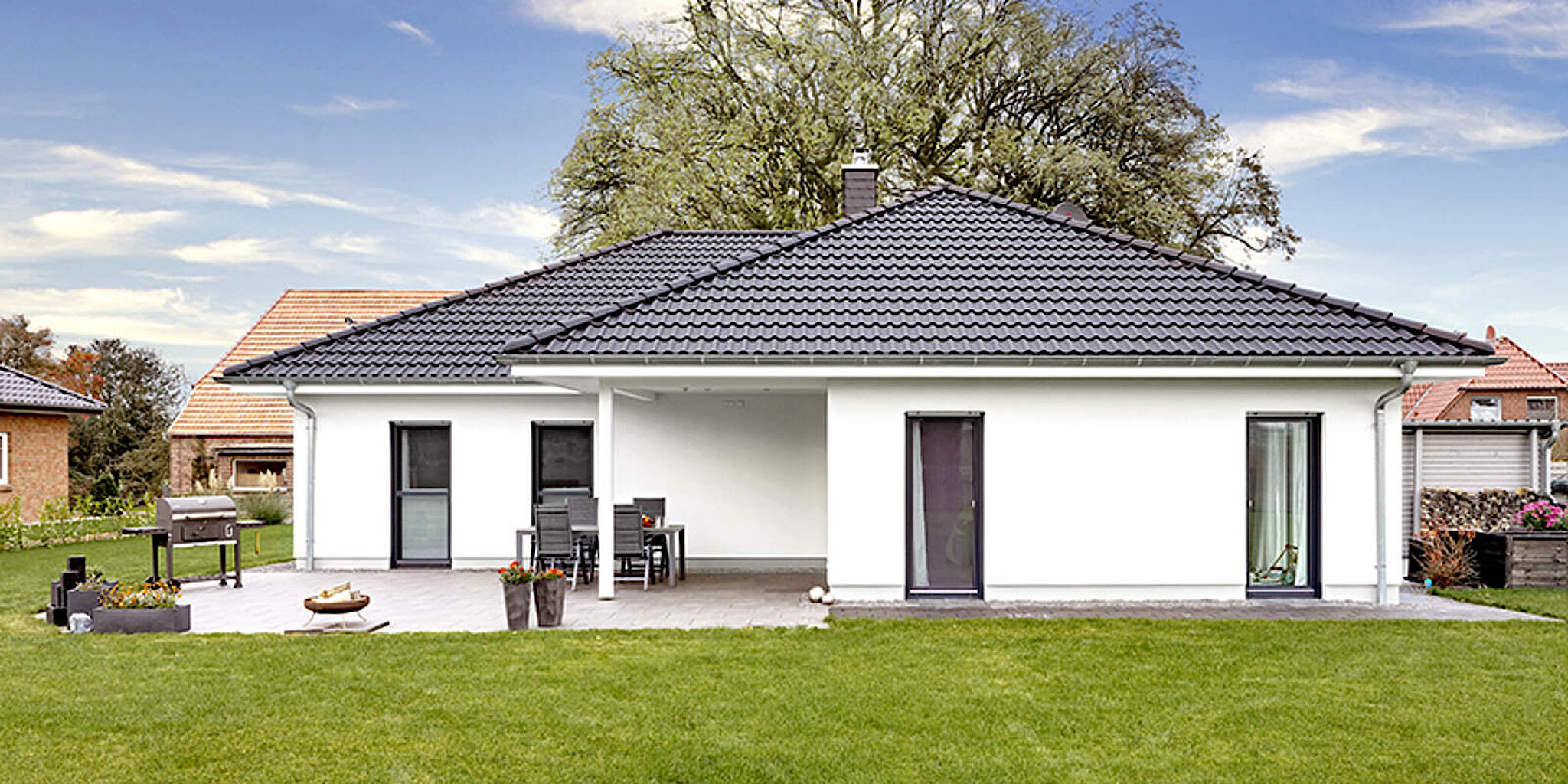 Ihr Wunschbungalow, realisiert nach dem Heinz von Heiden-Haustyp Cumulus 670, präsentiert sich mit einem schicken anthrazitfarbenen Dachstein und dazu farblich abgepassten Fensterelementen und Haustür. Dazu haben sich die Bauherren für einen Carport inklusive Schuppen entschieden, der in einem hübschen und ebenmäßigen Hellgrau gestrichen wurde.