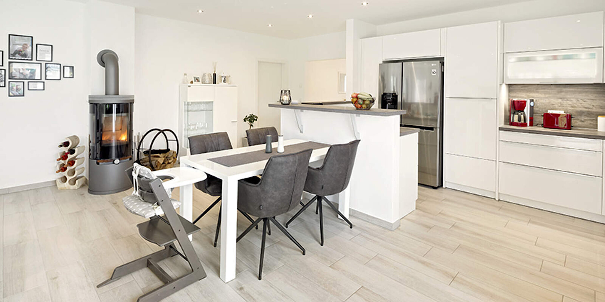 Über den Flur, an den direkt ein Gäste-WC mit Dusche und auch der Hauswirtschaftsraum angegliedert sind, gelangen die Bewohner in den großzügigen Wohn- und Essbereich. Die Küche ist, wie von Bauherrin Lina gewünscht, offen angelegt und mit einem kleinen Tresen vom Wohnzimmer abgetrennt, sodass sie immer alles im Blick haben, wenn der kleine Johann während des Kochens durchs Haus krabbelt. Zudem haben die Bewohner dank der bodentiefen Fenster einen wunderbaren Blick in den Garten und auf ein kleines Feld. Auch den Nachbarn könnte man zuwinken.