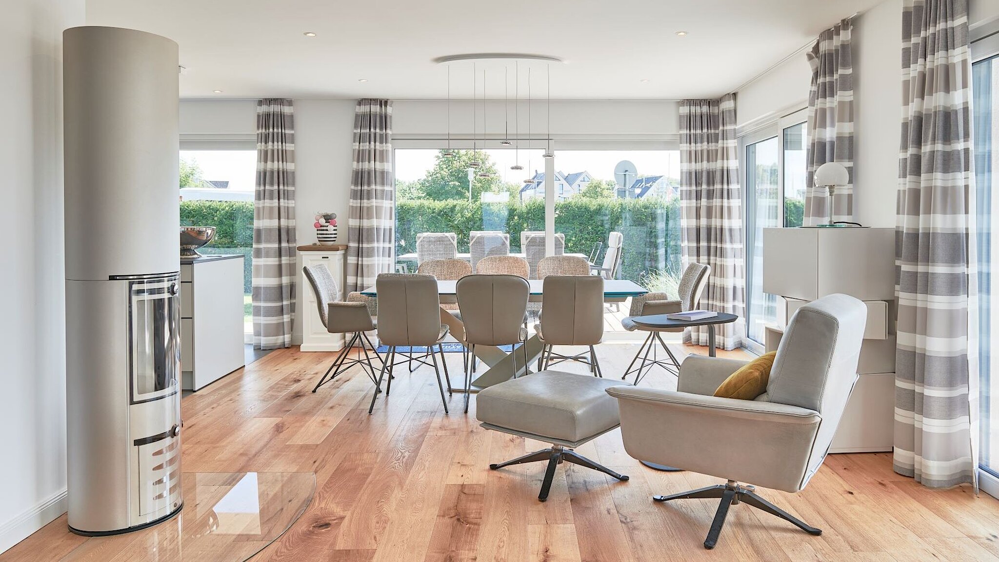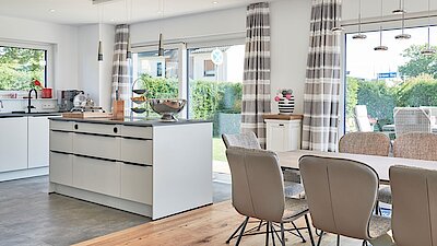 Da wir einen Großteil unserer Zeit in Gebäuden verbringen, ist unser Bedarf an Tageslicht von Natur aus sehr hoch. Auch unser Wohlbefinden ist von der richtigen Beleuchtung der eigenen vier Wände abhängig. Die Bauherren haben das bei ihrem Neubau praktisch umgesetzt: Insgesamt haben ganze acht Dachflächenfenster der Fa. Velux ihren Platz im zweigeschossigen Traumhaus gefunden. Durch die Positionierung zahlreicher Dachflächenfenster gelangt viel natürliches Tageslicht in das Hausinnere. Diese sind nicht nur günstiger als Gauben, sondern haben noch dazu einen viel größeren Lichteinfall – eine Baugenehmigung benötigt man in dem Fall auch nicht. Dachflächenfenster bieten eine optimale Beleuchtung und bringen gleichzeitig eine gemütliche Wohlfühlatmosphäre nach Hause. Das Tageslicht lässt die Räume noch wärmer und einladender wirken, sodass eine tolle Wohlfühloase entsteht. Außerdem geben sie den Bewohnern die Möglichkeit, jederzeit einen unverbauten Blick in den Himmel zu genießen oder das Tropfen des Regens zu hören. Die bequeme Handhabung und die problemlose Reinigung der Velux Dachflächenfenster sind auch nicht von der Hand zu weisen.