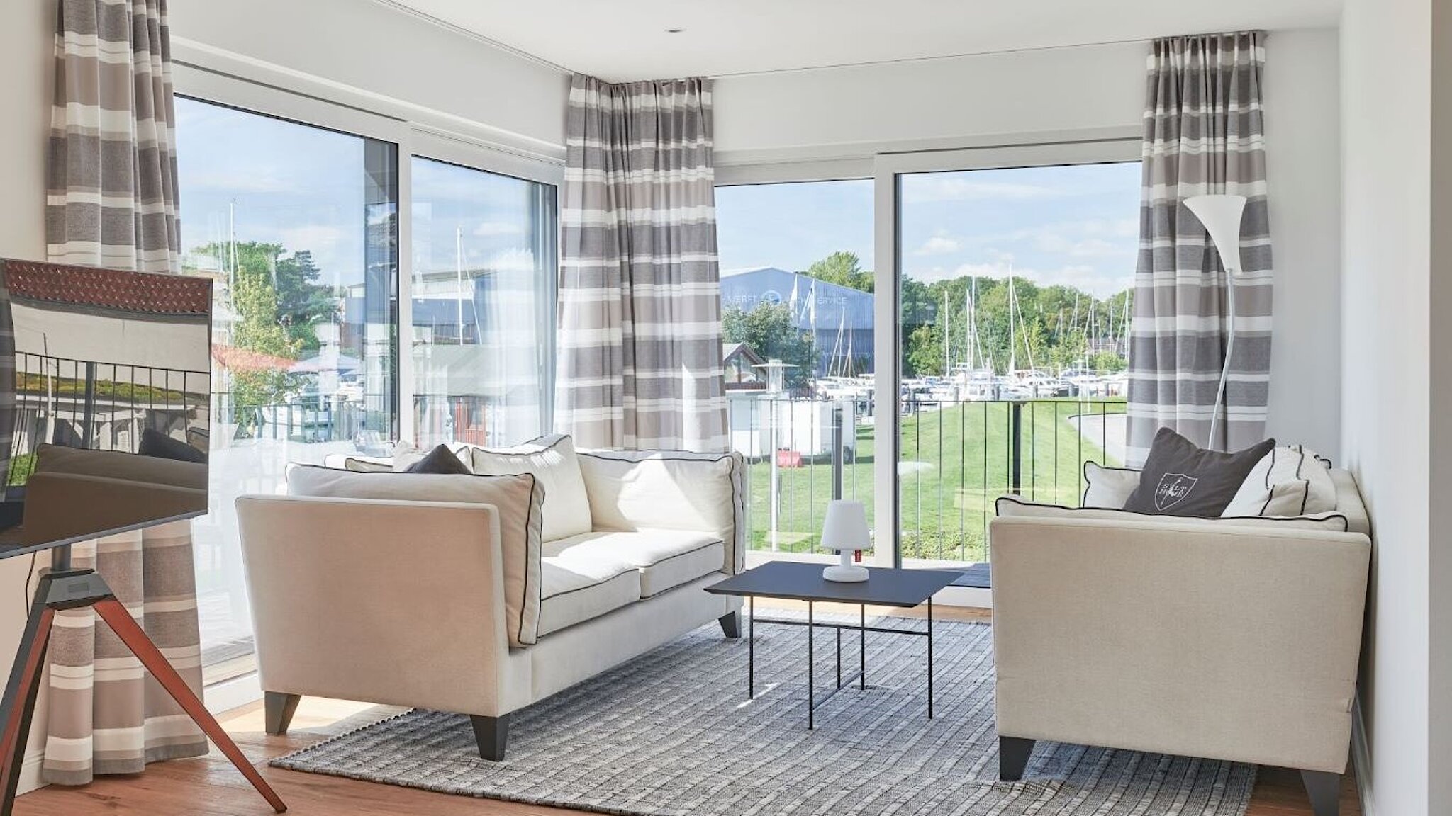 Durch die offene Gestaltung im Erdgeschoss kommt viel Licht in alle Räume. Der große Wohn- und Essbereich mit den vielen Fenstern grenzt gleich an die Küche. Ergänzt wird diese Etage durch ein Duschbad. Über die Stahltreppe mit den schönen Holzstufen gelangt man in das 1. Obergeschoss. Hier befindet sich ein weiterer Wohn- und Essbereich mit einer integrierten Küchenzeile sowie ein weiteres Duschbad. Zwei fast gleich große Schlafräume bieten der Familie viel Platz zum Träumen. Von den Wohn- und Schlafräumen ist der große Balkon über einen direkten Zugang zu erreichen und über den Balkon aus können die Bauherren den herrlichen Blick auf den Hafen der Ostsee genießen.