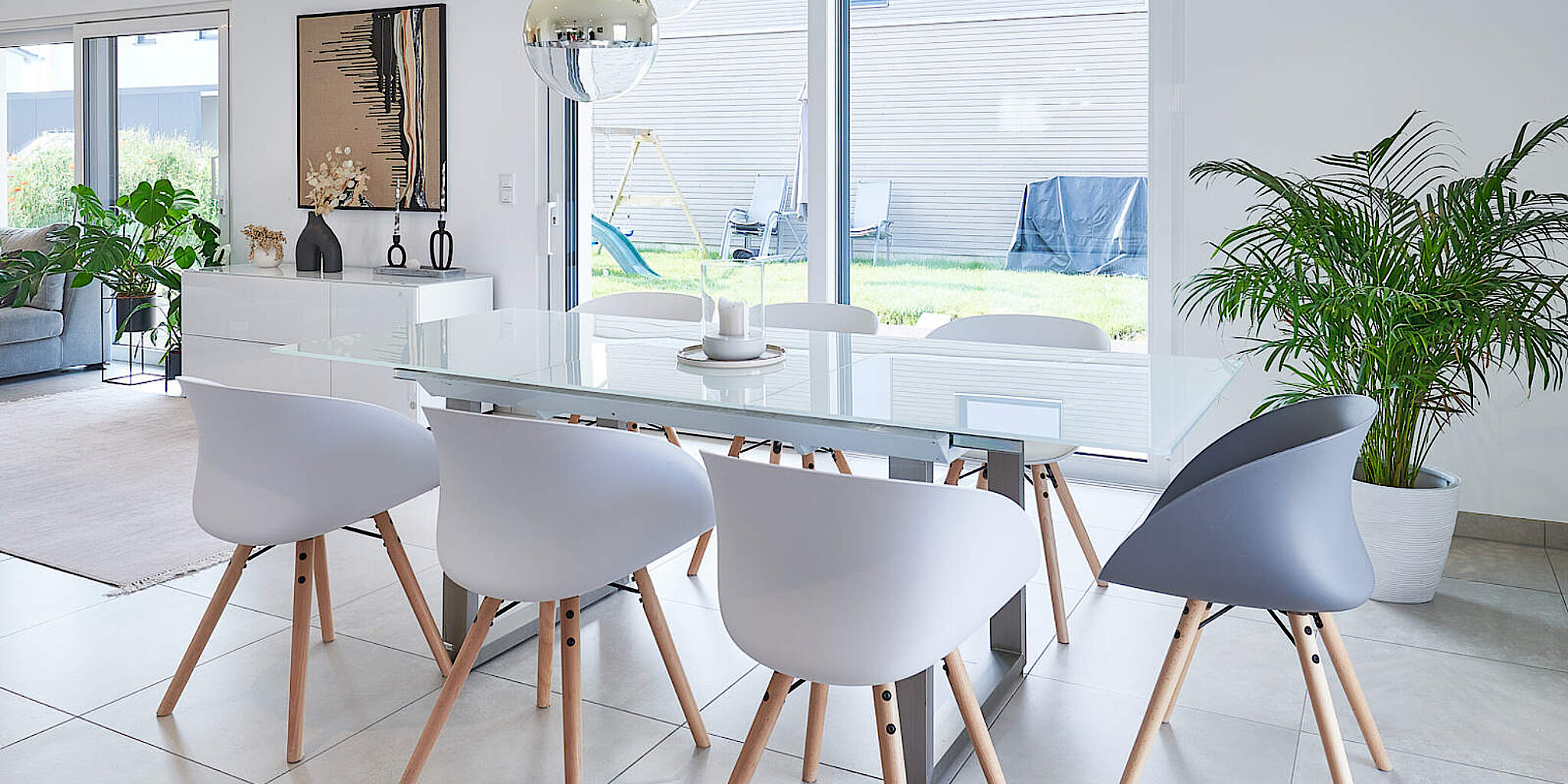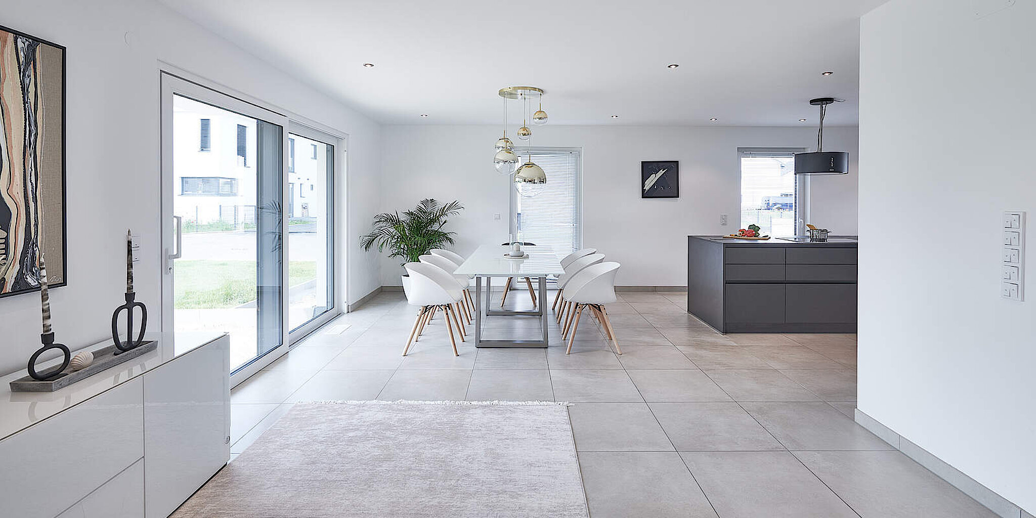Kommt man zum Flur hinein, bemerkt man recht schnell wie durchdacht das Haus unserer Bauherren ist. Direkt unter der Treppe ist eine große Garderobe mit viel Stauraum angelegt. Geht man weiter in den offenen Wohn- und Essbereich, der insgesamt 44,30 m² groß und durch die bodentiefen Fenster lichtdurchflutet ist, kann man sich nur wohlfühlen. Die helle und sehr sinnvoll strukturierte Küche ergänzt das Bild perfekt. Im Erdgeschoss befinden sich darüber hinaus noch ein Gäste-WC und ein Hauswirtschaftsraum.