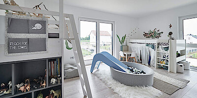 Begibt man sich ins Obergeschoss stellt man fest, dass auch hier nochmal ordentlich Platz für die ganze Familie ist. Das Haus ist großzügig geplant, was sich gerade im Nachhinein als äußerst sinnvoll herausstellt. Die Bauherrin wird kurz nach der Planungsphase nämlich schwanger. Ein Mädchen kündigte sich an und stellte die Familie vor eine kleine Herausforderung, da nur zwei Kinderzimmer im Obergeschoss vorgesehen waren. Ganz nach dem Motto „es gibt keine Probleme, es gibt nur Lösungen“ wurde die Zimmeraufteilung kurzerhand umgeplant. Die beiden Jungs bekamen ein 21,23 m² großes Reich zusammen und die kleine „Prinzessin“, wie sie von der Familie liebevoll genannt wird, erhält ihr eigenes 17,51 m² großes Reich. Die Bauherrin hatte auch das fertig eingerichtete Badezimmer schon bildlich im Kopf. Daher war die Stellfläche neben der Badewanne besonders wichtig. Das Elternschlafzimmer mit integrierter Ankleide, ist als Rückzugsort für die Eltern sehr wertvoll und mit einer Größe von 20,44 m² für die Baumfamilie mehr als ausreichend. Das Obergeschoss wird durch die Galerie, die aktuell als Arbeitsplatz verwendet wird, abgerundet.