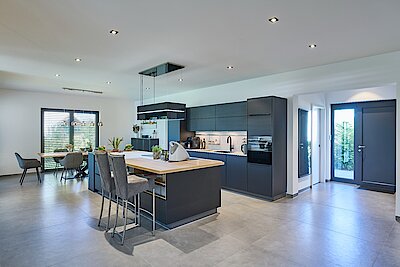 Die offene Gestaltung der Räume sorgt für eine harmonische Verbindung zwischen den verschiedenen Bereichen und lässt das Erdgeschoss besonders einladend und geräumig wirken. Eine moderne Küche ist nahtlos in den Wohnbereich integriert, wodurch auch beim Kochen nie der Kontakt zu den Gästen oder Familienmitgliedern verloren geht. Ein optisches Glanzstück ist die Holztreppe mit dem darunterliegenden Podest und dem Geländer aus Glas.