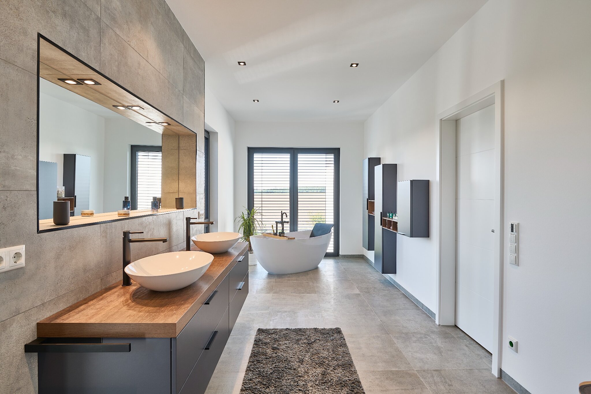 Im oberen Stockwerk befindet sich das luxuriös gestaltete Badezimmer mit einer Größe von mehr als 20m². Das Highlight dieses Raumes ist zweifellos die freistehende Badewanne, die zu entspannenden Stunden einlädt. Die Badewanne wurde direkt am Fenster platziert, wodurch eine herrliche Atmosphäre entsteht. Hochwertige Materialien sorgen für eine harmonische Verbindung von Eleganz und Behaglichkeit.