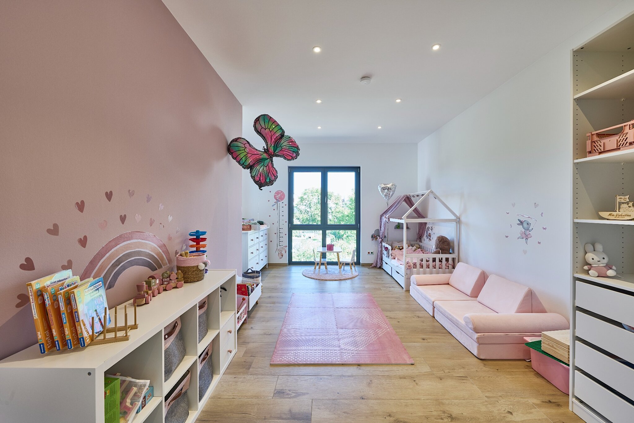Neben dem Badezimmer befinden sich im Obergeschoss noch zwei fast gleich große Kinderzimmer und ein Gästezimmer. Ein weiteres besonderes Detail ist im Schlafzimmer zu finden. Eine Wand wurde als Nische für den Kleiderschrank angelegt, die aber auch gleichzeitig als Rückwand für das Bett dient.